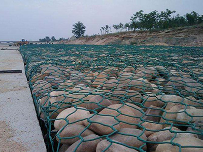 綠濱墊具有固堤防沖刷的作用, 固濱籠工藝是指將特種鋼絲由專用機(jī)械編織成雙絞、蜂巢形網(wǎng)目的格網(wǎng)片,根據(jù)工程設(shè)計(jì)要求,裁剪、設(shè)計(jì)、組裝成箱籠并裝入塊石等填充料后連接成一體的結(jié)構(gòu),用作提防、路基防護(hù)工程。